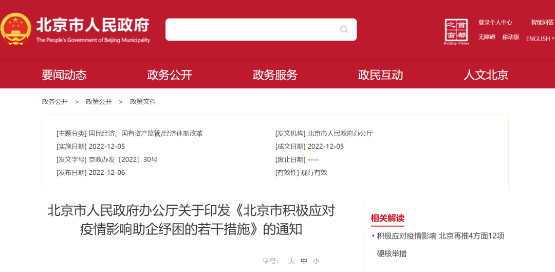11月以来,面对新冠肺炎疫情发生以来最复杂、最严峻的防控形势,坚决贯彻党中央国务院决策部署,高效统筹疫情防控和经济社会发展,按照市委市政府要求,最大限度减少疫情对经济社会发展影响。为切实帮助市场主体纾困解难,推动经济回稳向上,制定出台《北京市积极应对疫情影响助企纾困的若干措施》(京政办发〔2022〕30号,以下简称“新12条”)。