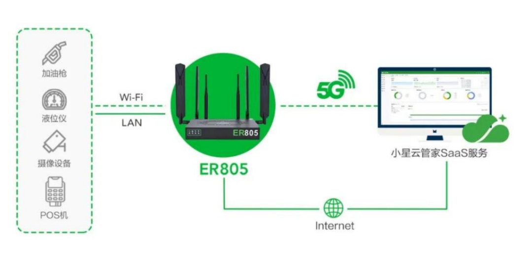 ER805支持高带宽、低时延的5G网络,监控设备通过千兆网口连接,有效保障了现场视频的稳定传输,便于加油站对车辆进出、员工的操作过程进行监管。