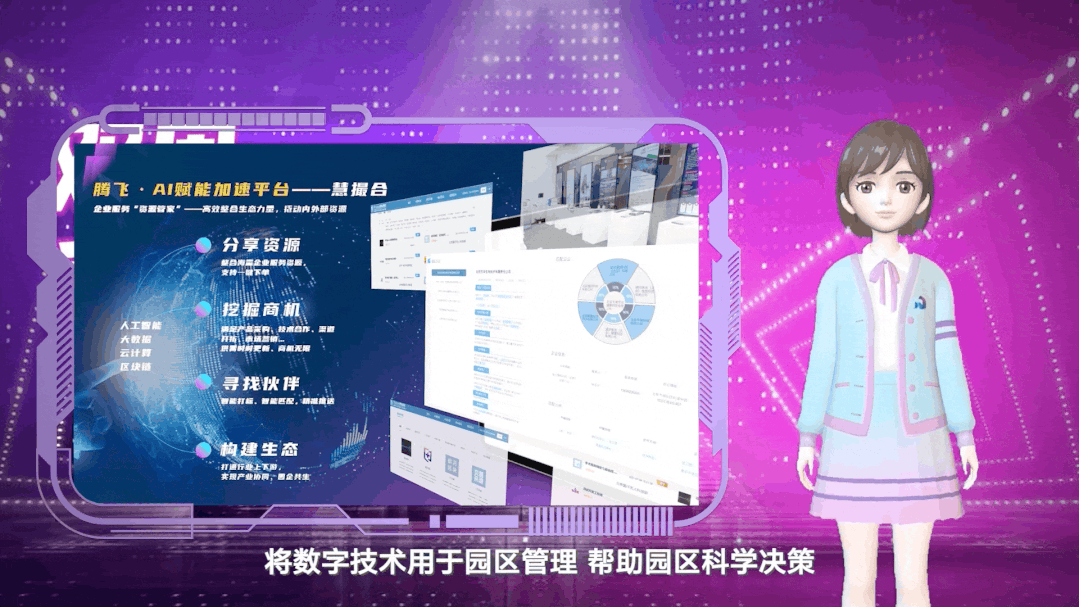在产品代言方面,数字人不同的个性特点,正好代表着园区的两大核心数字产品。数据分析高手“望小十”,作为园区数字助手,代言“腾飞·赋智园区智能评价系统”;“望翎依”则因为善于整合资源、亲和易沟通,成为园区的资源管家,代言腾飞·AI赋能加速平台——“慧撮合”。后续,他们将与产品深度融合,用更加丰富生动的方式将抽象的科技诠释得通俗易懂。