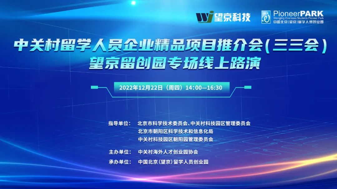 由北京市科学技术委员会、中关村科技园区管理委员会、北京市朝阳区科学技术和信息化局、中关村科技园区朝阳园管理委员会指导,中关村海外人才创业园协会主办,中国北京(望京)留学人员创业园承办的2022年度最后一场“三三会”——中关村留学人员企业精品项目推介会(三三会)望京留创园专场线上路演,将于2022年12月22日(周四)14:00,通过线上形式重磅来袭。