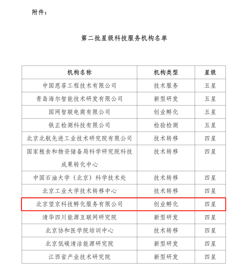 凭借在基础能力、管理能力、经营能力、财务能力、社会信用记录及行业知名度六大维度超40项评价指标中的优异表现,望京留创园运营主体——北京望京科技孵化服务有限公司被认定为创业孵化领域全国四星级科技服务机构!