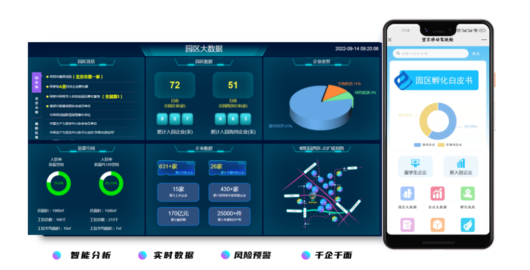 腾飞•赋智园区智能评价系统基于国家标准,多维度建模,实时跟踪企业孵化数据,实现“千企千面”智能化孵化服务,系统搭载企业信息管理平台、企业画像可视化平台、园区运营管理平台、领导驾驶舱等智慧园区平台,构建线上线下互动支撑孵化网络体系,实现企业“管家式”精准服务和成果评估,以数据辅助决策,以技术预警企业,以科技赋能园区。