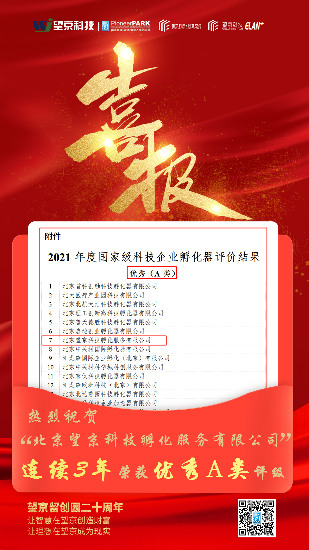 北京市共有18家国家级科技企业孵化器入选优秀(A类),凭借出色的创业服务和完善的孵化体系,北京望京科技孵化服务有限公司(望京科技园孵化器)荣登A类榜单,荣获“优秀(A类)”评级,这也是连续三年获此殊荣!