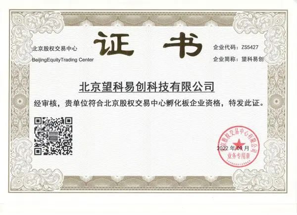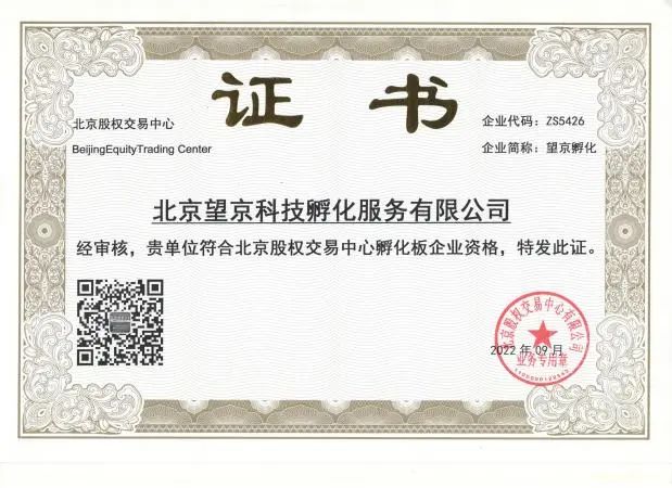 9、2022年9月,望京留创园运营主体——北京望京科技孵化服务有限公司、望京科技·易蓝空间运营主体——北京望科易创科技有限公司,成功挂牌展示,荣获四板证书!