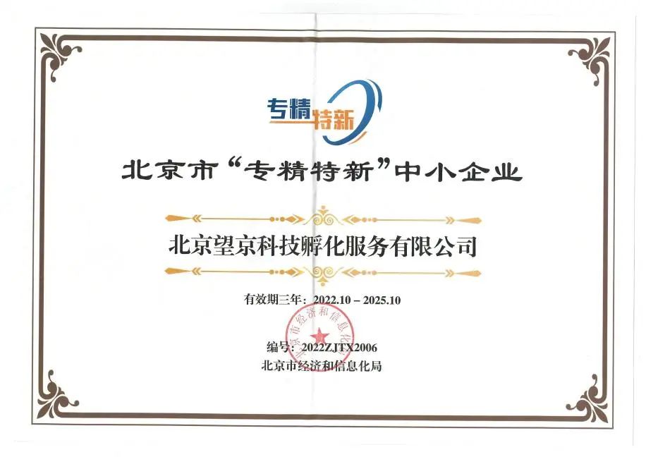 6、2022年10月,望京留创园运营主体——北京望京科技孵化服务有限公司被北京市经信局认定为北京市“专精特新”中小企业!
