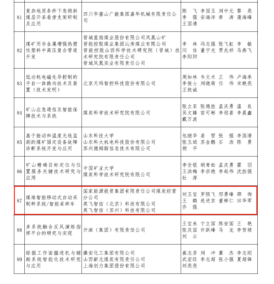 日前,2022年度“中国煤炭工业协会科学技术奖”对外公布,园区高成长企业——英飞智信(北京)科技有限公司与国家能源投资集团有限责任公司煤炭经营分公司共同承担的“煤堆智能移动式自动采制样系统/智能采样车”项目荣获2022年度“中国煤炭工业协会科学技术奖”三等奖!