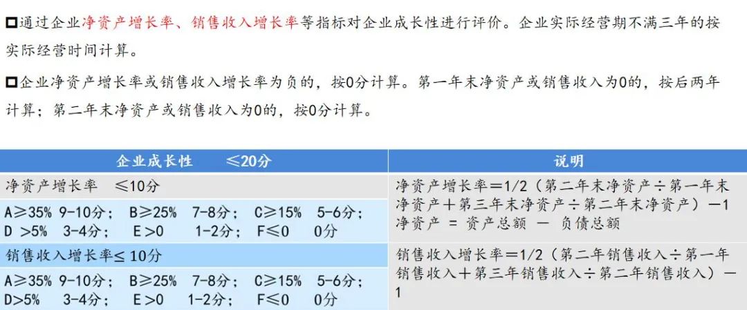 由财务专家选取企业净资产增长率、销售收入增长率等指标对企业成长性进行评价。企业实际经营期不满三年的按实际经营时间计算。计算方法如下: