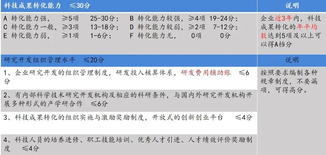 由技术专家根据企业研究开发与技术创新组织管理的总体情况,结合以下几项评价,进行综合打分。 (1)制定了企业研究开发的组织管理制度,建立了研发投入核算体系,编制了研发费用辅助账;(≤6分) (2)设立了内部科学技术研究开发机构并具备相应的科研条件,与国内外研究开发机构开展多种形式产学研合作;(≤6分) (3)建立了科技成果转化的组织实施与激励奖励制度,建立开放式的创新创业平台;(≤4分) (4)建立了科技人员的培养进修、职工技能培训、优秀人才引进,以及人才绩效评价奖励制度。(≤4分)