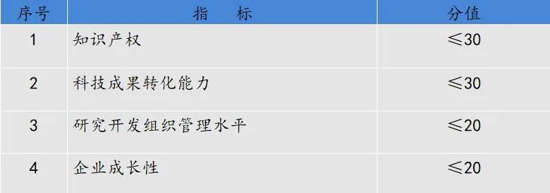 企业创新能力主要从知识产权、科技成果转化能力、研究开发组织管理水平、企业成长性等四项指标进行评价。各级指标均按整数打分,满分为100分,综合得分达到70分以上(不含70分)为符合认定要求。四项指标分值结构详见下表: