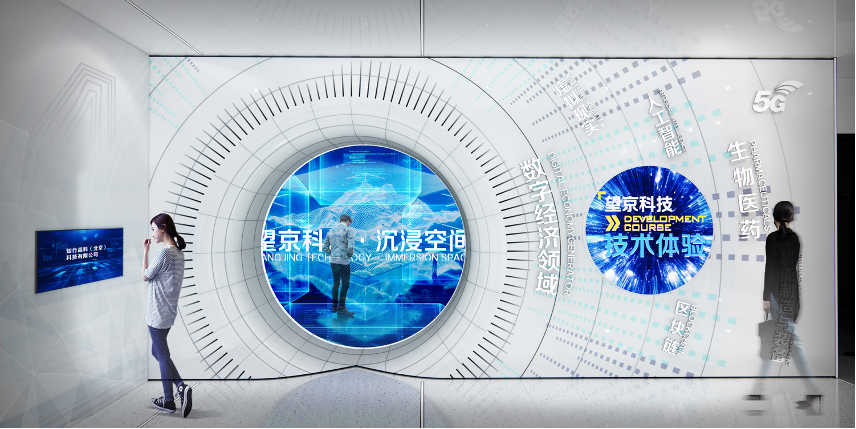 望京留创园数智展厅位于望京科技园E座一层望京科技·易蓝空间内,占地80平米,于2022年初正式启动搭建工作。展厅以“数字化、智能化、定制化、精准化”为设计理念,围绕“过去、现在与未来”打造集团体系内首个数智展厅,以先进的科技与酷炫的技术实现望京留创园科技化、国际化的能级跃迁,充分发挥沉浸式、交互性等优势,通过最先进的数字化展示手段,使望京留创园呈现全新的生命力。展厅能够实现展览展示、宣传科普、创新服务、科技孵化四大核心功能,既是展览展示的宣传中心,也是数字科技的赋能中心,更是服务生态的集聚中心。