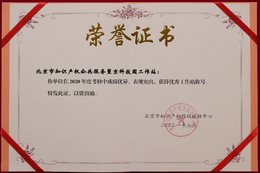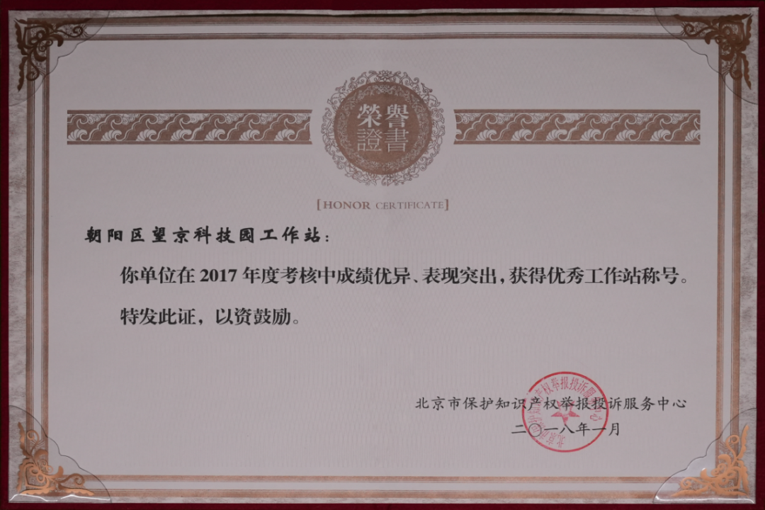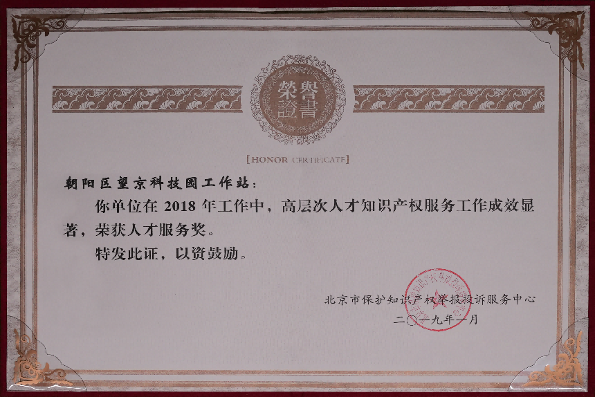 2010年,经北京市知识产权局认证,设立望京科技园知识产权工作站,由望京留创园运营主体北京望京科技孵化服务有限公司承担具体工作,并以望京留创园作为服务载体。凭借着突出的国际化优势和出色的知识产权服务能力,望京科技园知识产权工作站多次被授予“优秀工作站”和“人才服务奖”;2021年望京留创园被北京市知识产权局、北京市科学技术委员会、中关村科技园区管理委员会认定为北京市中小企业知识产权集聚发展示范区;2022年被评为北京市首批海外知识产权维权服务联络站,成为朝阳区首家且唯一一家海外知识产权维权服务联络站;2022年,在市中心组织开展的首届北京市知识产权公共服务优秀案例评选工作中荣获“优秀案例”奖。