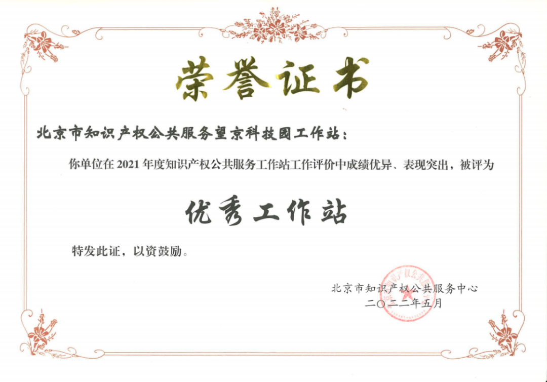 近日,北京市知识产权公共服务中心正式发布“2022年度全市知识产权公共服务工作站评价结果”,凭借完善的知识产权服务链条和高质量的知识产权服务成效,望京科技园知识产权工作站在全市88家知识产权工作站评比考核中独占鳌头,排名北京市第一名,且继2020年以来,连续三年蝉联朝阳区第一名,荣获北京市首批“标杆工作站”称号。