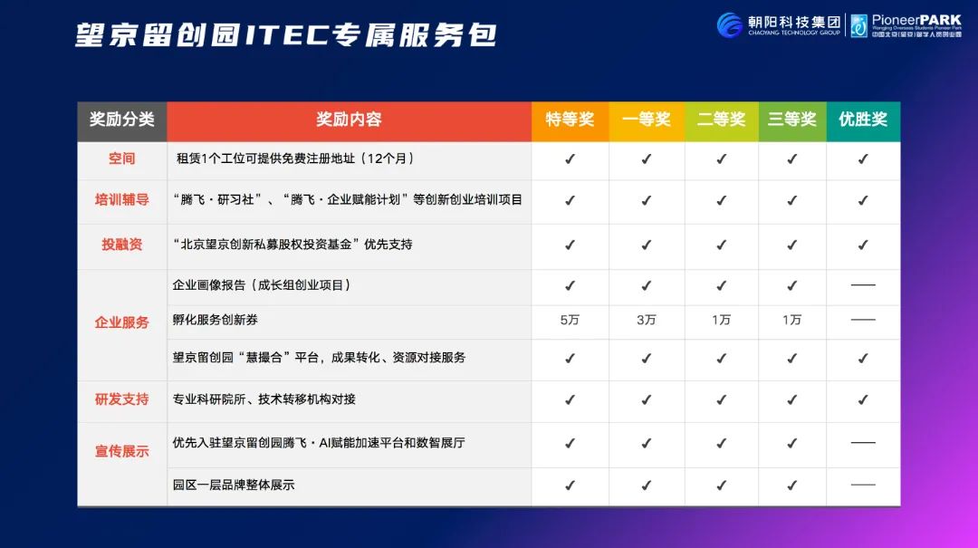 为切实做好对优秀创新创业项目的落地培育,望京留创园践行集团战略,以赛促招,整合大量生态资源推出园区版“ITEC专属服务包”,更特别打造了上千平米的“朝阳区人才创业孵化基地”,联合海外高层次人才中心,支持大赛优秀项目入驻,配套帮扶服务,全力推动区域数字经济快速健康发展,构建朝阳特色的科技创新生态。