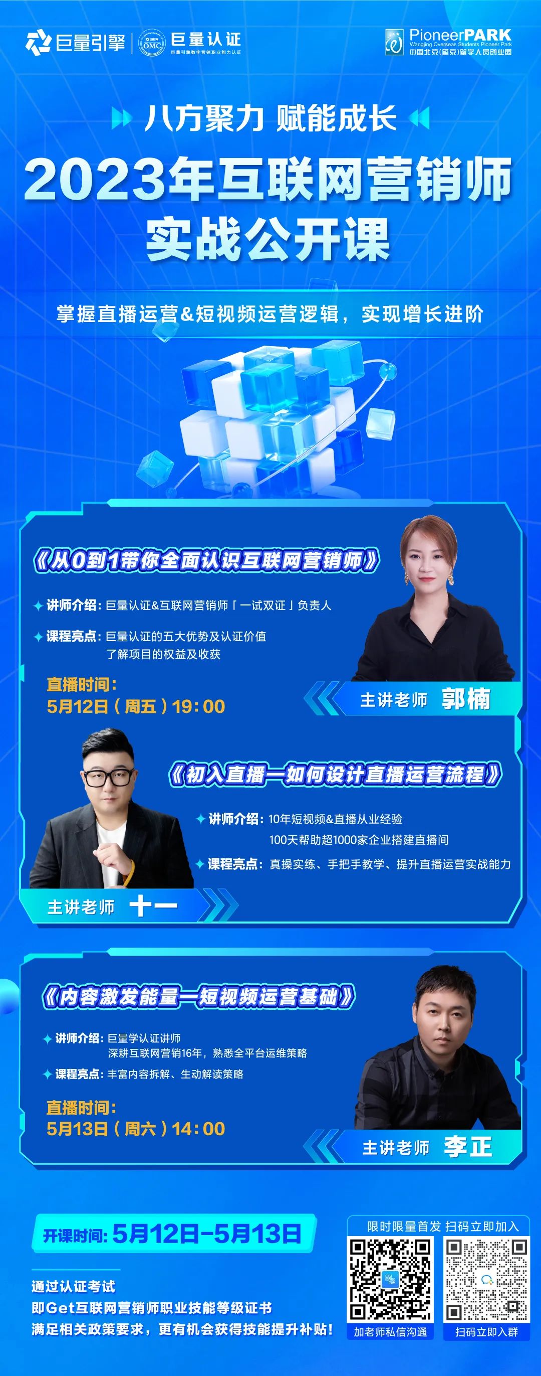 为了关于更好的为园区入驻企业在短视频、直播、电商、广告等数字营销领域持续注入新活力,5月12日-13日,望京留创园联合巨量认证共同发起2023年互联网营销师实战公开课活动!课程内容涵盖互联网营销师项目科普、直播运营流程、短视频运营基础等内容。最大程度提炼直播、短视频运营实战技巧,全方位掌握直播运营、短视频运营逻辑和玩法,实现增长进阶,欢迎大家扫码进群!