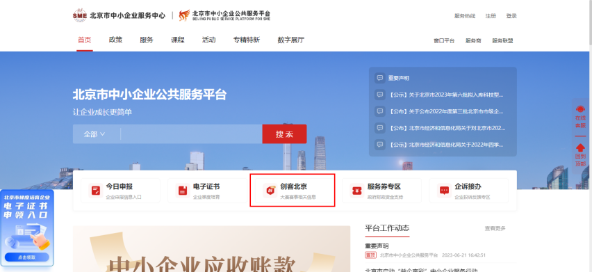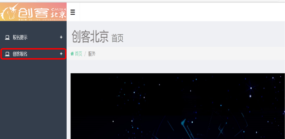 4、在登录状态下,点击网站首页“创客北京”专区入口或者点击右侧“工作台-创客北京系统”,均可进入大赛报名专区。