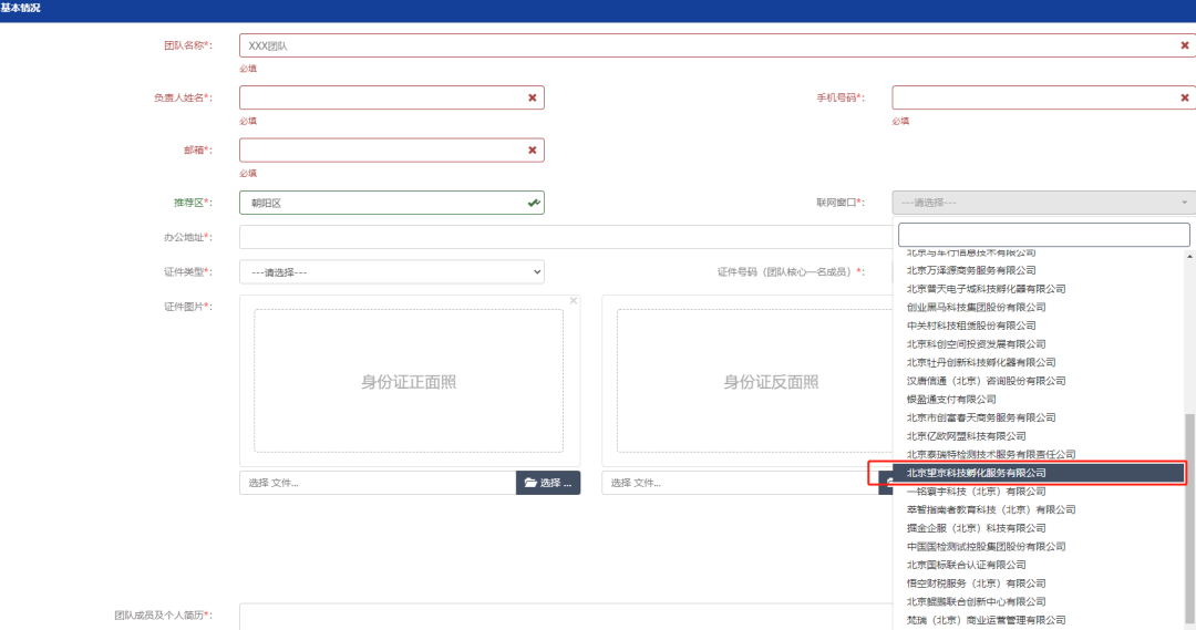 请仔细阅读下方报名指引,填写报名资料时需特别注意,推荐区选择“朝阳区”,联网窗口选择“北京望京科技孵化服务有限公司”。