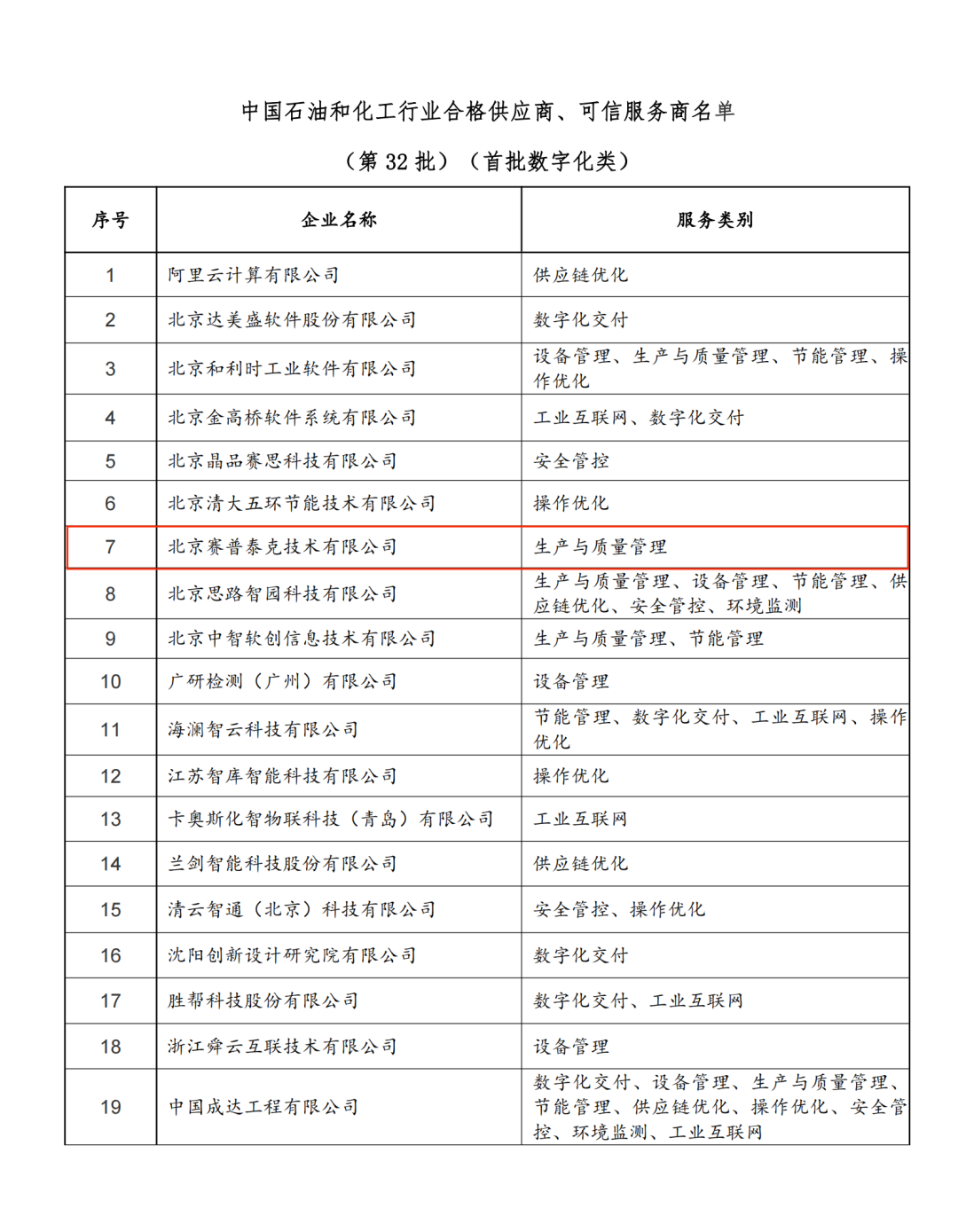 2023年9月12日,中国石油和化学工业联合会供应链工作委员会公示了中国石油和化工行业合格供应商、可信服务商评价工作(第32批)(首批数字化类)结果,依据企业在石化行业供应商寻源平台上申报材料,在公开、公平、公正的原则下,经评价组初审、模型筛选、专家评价、专家评价会复议、网上公示等环节,拟定北京赛普泰克技术有限公司等19家企业为中国石油和化工行业可信服务商(企业排名不分先后,见下图)。