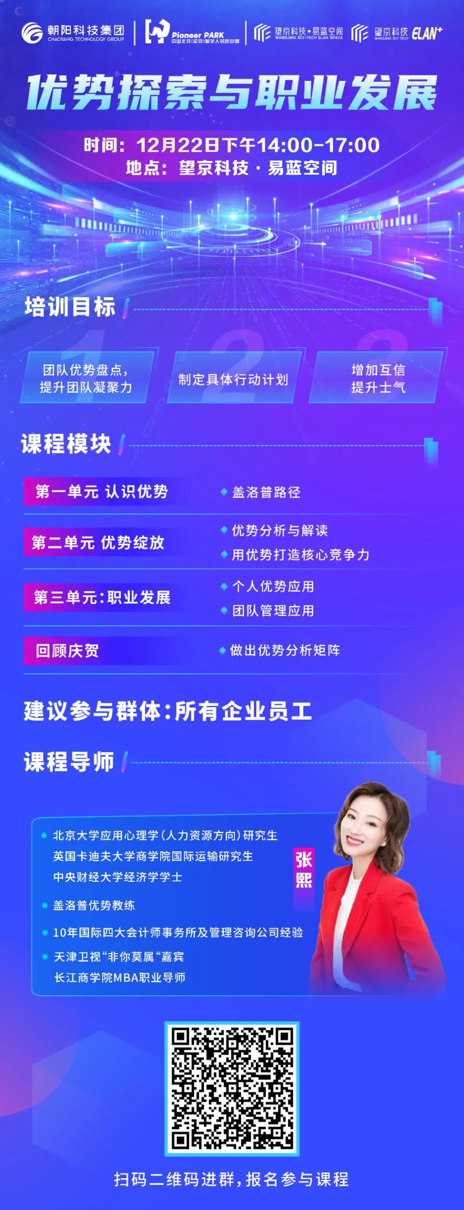 为帮助园区企业人员更清晰地认知和了解自身优势和兴趣,选择适合自己的职业道路,从而取得长期的职业发展和成功。12月22日下午14:00—17:00,“腾飞·研习社”将于望京科技•易蓝空间开展线下培训课程。课程邀请北京大学应用心理学(人力资源方向)硕士、盖洛普优势教练、长江商学院MBA职业导师张熙担任主讲老师,以“优势探索与职业发展”为主题,引领带动参训人员明确自身优势,科学规划新一年的职业发展路径,为未来职业生涯的稳定向好生长打下坚实基础。