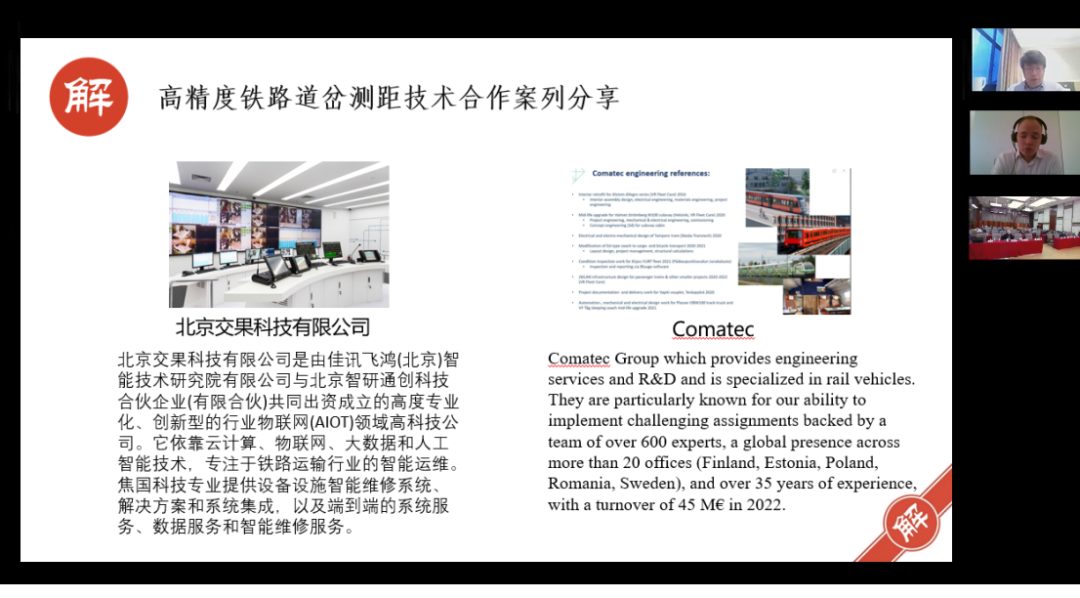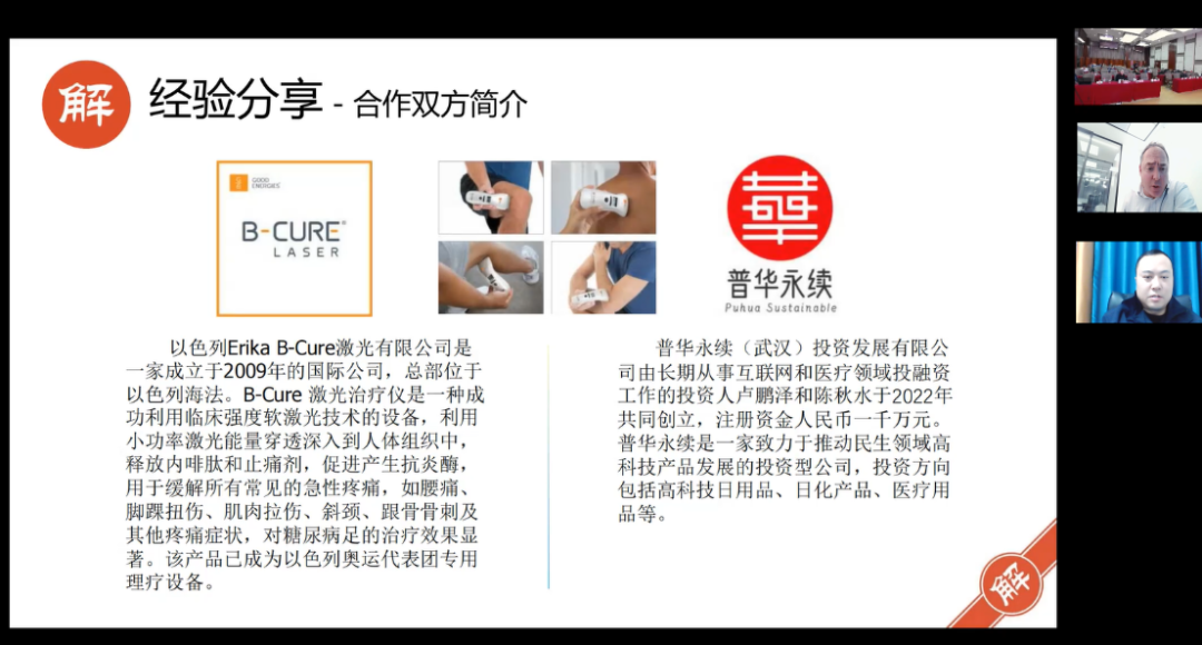 案例分享环节,中外企业家、专家和解网团队的协调人实例解读通过解网如何助力中外企业人才,高效开展国际合作的全过程。北京交果科技有限公司研发总经理李瀚,芬兰Comatec公司高级自动化设计工程师Tuomas Du-Ikonen围绕“高精度铁路道岔测距技术”联合研发合作进行了案例分享;北京必克爱尔科技有限公司董事长卢鹏泽,以色列B-Cure Laser公司CEO Ronen Goldstein围绕“以色列LLLT 低强度激光疼痛疗法在中国市场的应用”进行了合作经验分享。解网平台集聚的国际高端人才资源与其特有的在线协同数字工具为中外企业人才开展高效创新协作、联合实现创新突破提供了有力的支撑。