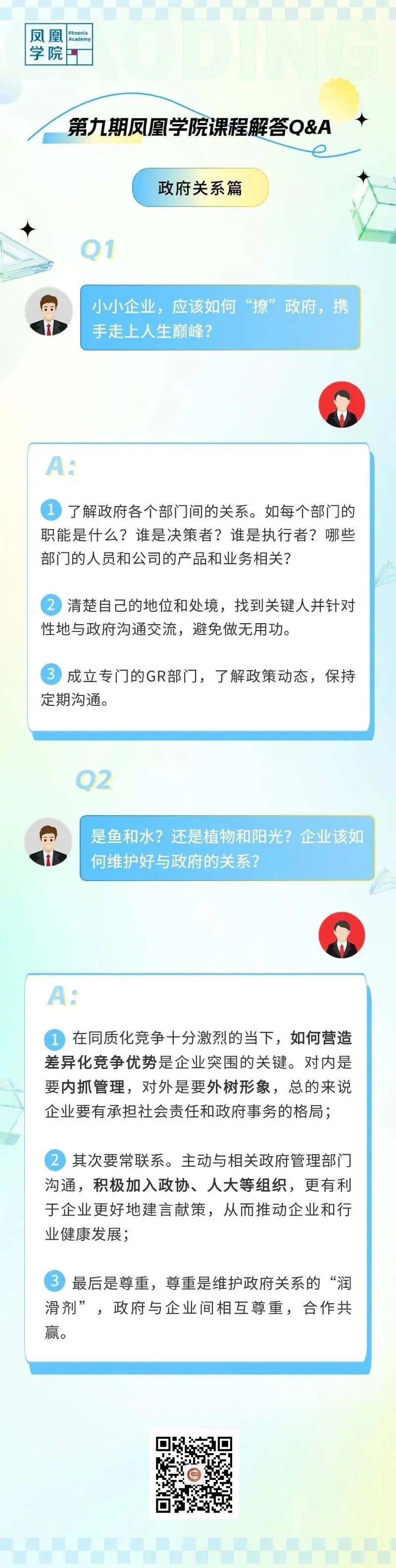 凤凰学院在政府关系和政策讲解的课堂中特别设置提问环节,学员们针对“我们应该怎样与政府建立联系”“我们想要申报专精特新小巨人,审核周期大概多久”等创业者关注问题进行提问。专家结合政策及企业实际情况为大家一一指明方向,并提供更加明确的实操“路线图”。