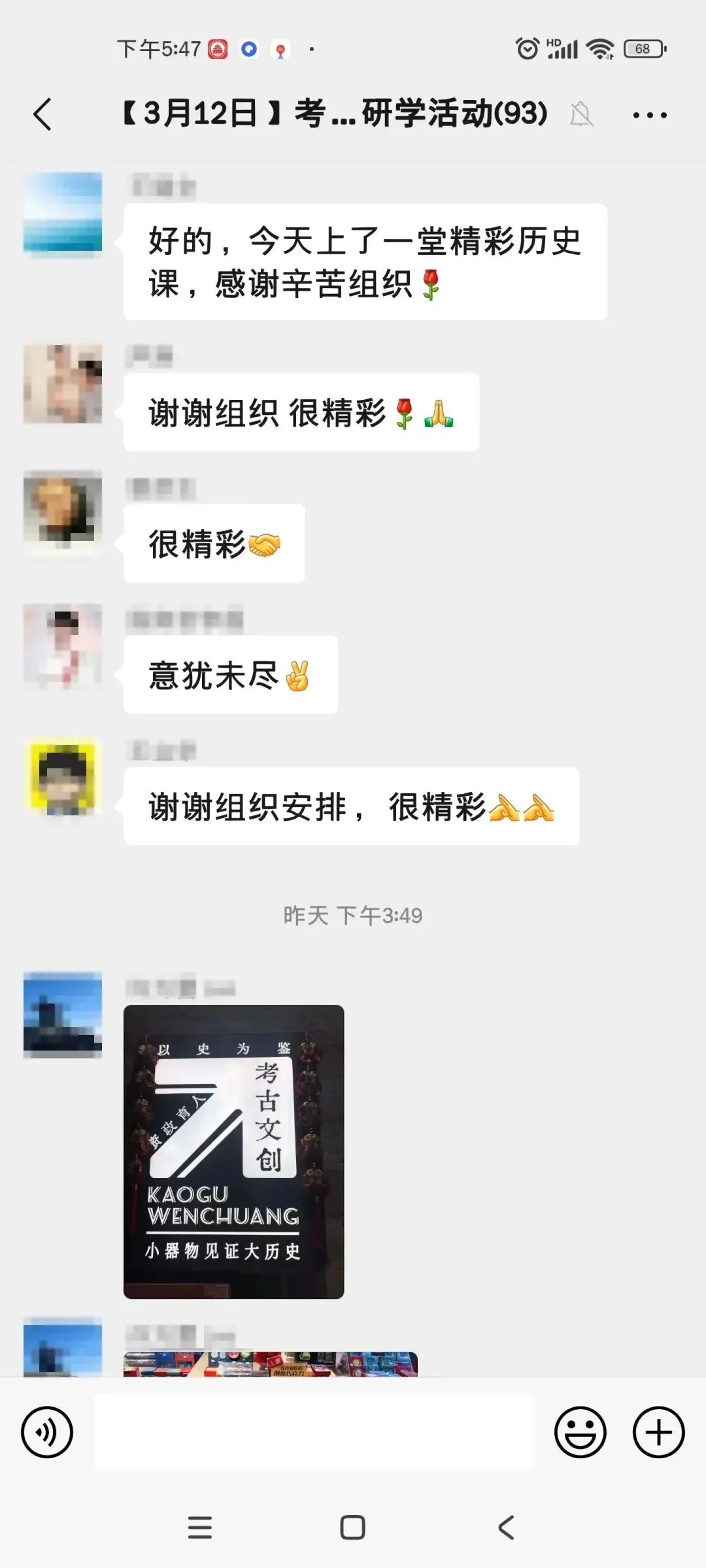 感谢朝阳区高层次人才服务中心组织活动。穿梭于美妙生动的陶土人物、俊秀雅致的挂件配饰之间,我们一边全神贯注听讲解,一边驻足流连,不知不觉一下午的时间,领略中国5000年来出土的古代文物、古籍,感知中国灿烂辉煌的历史文化,我们为祖国悠久的历史文化自信自豪。尊重历史规律,古为今用,是中华民族延续5000年生生不息的智慧源泉,今天接力棒传到我们手中,在汲取系统化有深度的中国历史文化基础上,探寻民族与世界的历史发展规律,借一带一路的良机,与秉持真善美的国家合作,携手共同丰富和发展人类的历史文明。