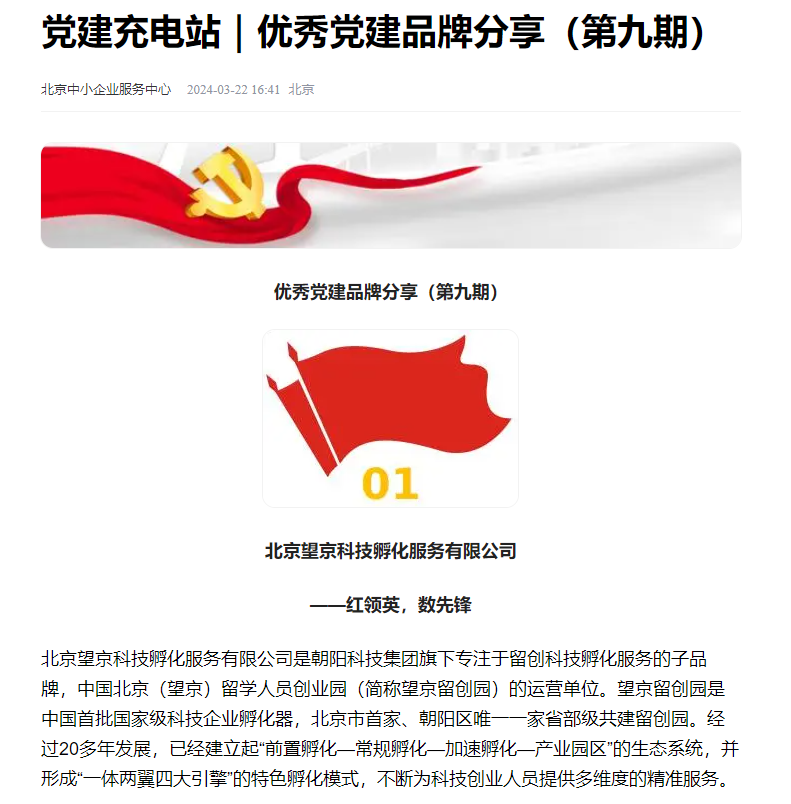 近日,朝阳科技集团党委所属党支部——望京科技孵化党支部,凭借数智化打造产业链党建的特色,入选北京市经信局直属的北京市中小企业服务中心“优秀党建品牌”,报道原文如下: