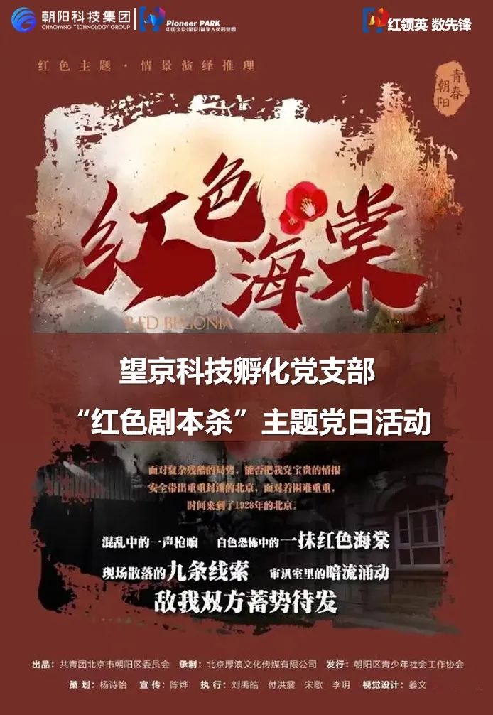 近日,为加强基层党组织建设,创新党建形式,激励青年人才传承中国共产党的优良传统,不忘初心,勇敢逐梦。朝阳科技集团党委所属党支部——望京科技孵化党支部,参与朝阳共青团“青运百年”沉浸式剧本体验活动,联合园区企业党支部——北京博汇特环保科技股份有限公司党支部,以“传承红色基因,汲取前行力量”为主题,开展了一场别开生面的“红色剧本杀”主题党日活动。