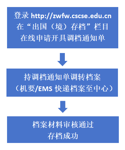 注:为进一步简化档案调转手续,自2024年起,在我中心档案管理处申请出国(境)存档的留学人员可从毕业学校直接转档至我处。
