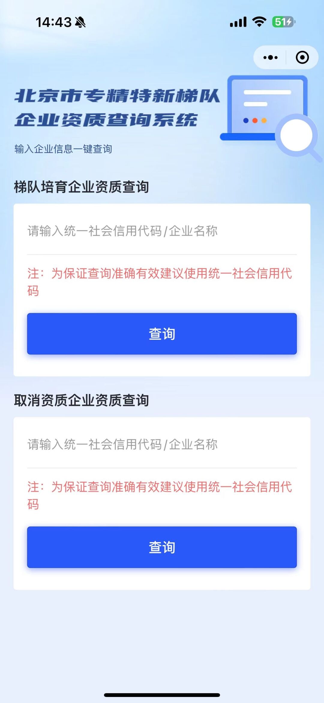 第二步:选择资梯队培育企业资质查询或取消资质企业查询,输入统一社会信用代码或企业完整名称,点击“查询”按钮