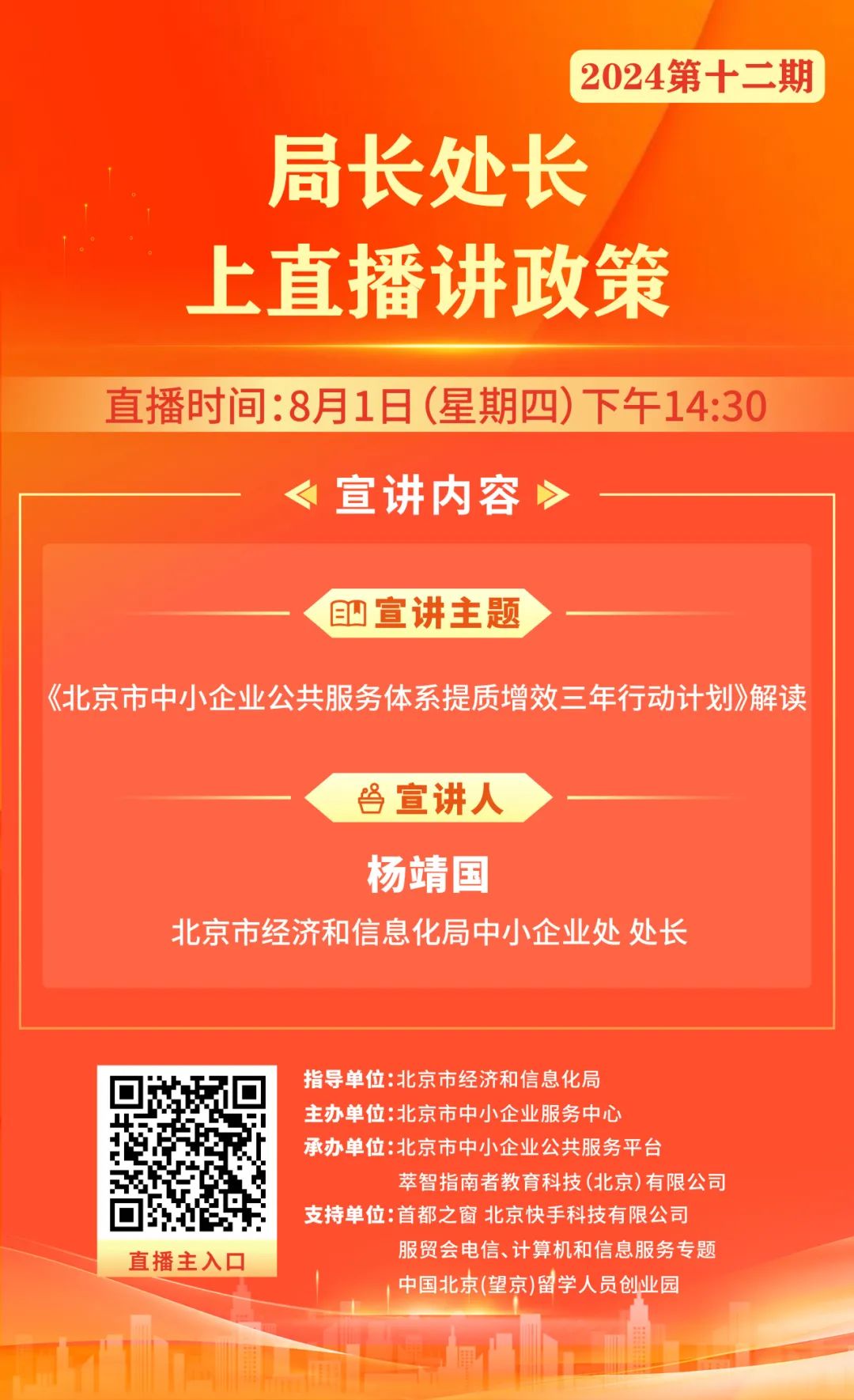 北京市经济和信息化局中小企业处处长杨靖国将于8月1日下午14:30,直播解读《北京市中小企业公共服务体系提质增效三年行动计划》,介绍三年行动的总体要求,重点任务等内容。
