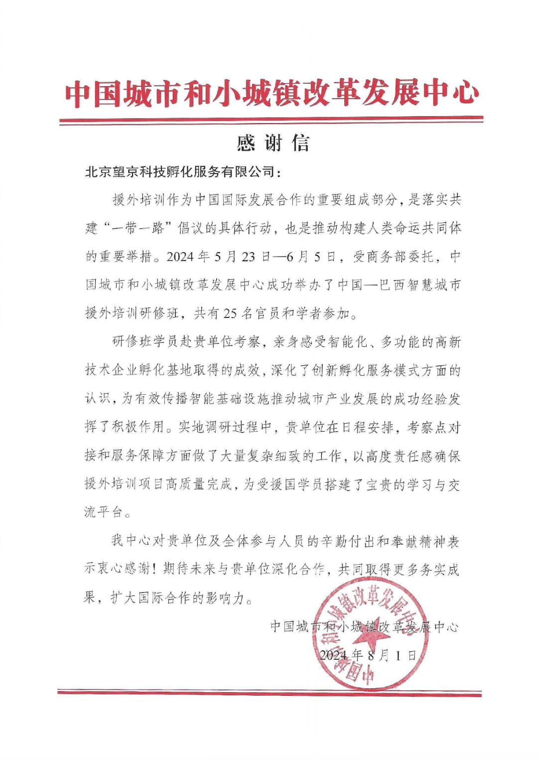 8月初,继ITEC创新创业园入驻企业汉熵通信给望京留创园来信致谢后,园区又收到一封来自中国城市与小城镇改革发展中心的感谢信,对园区在今年5月下旬中国-巴西智慧城市研修班实地调研过程中的点位对接与服务保障表示感谢。