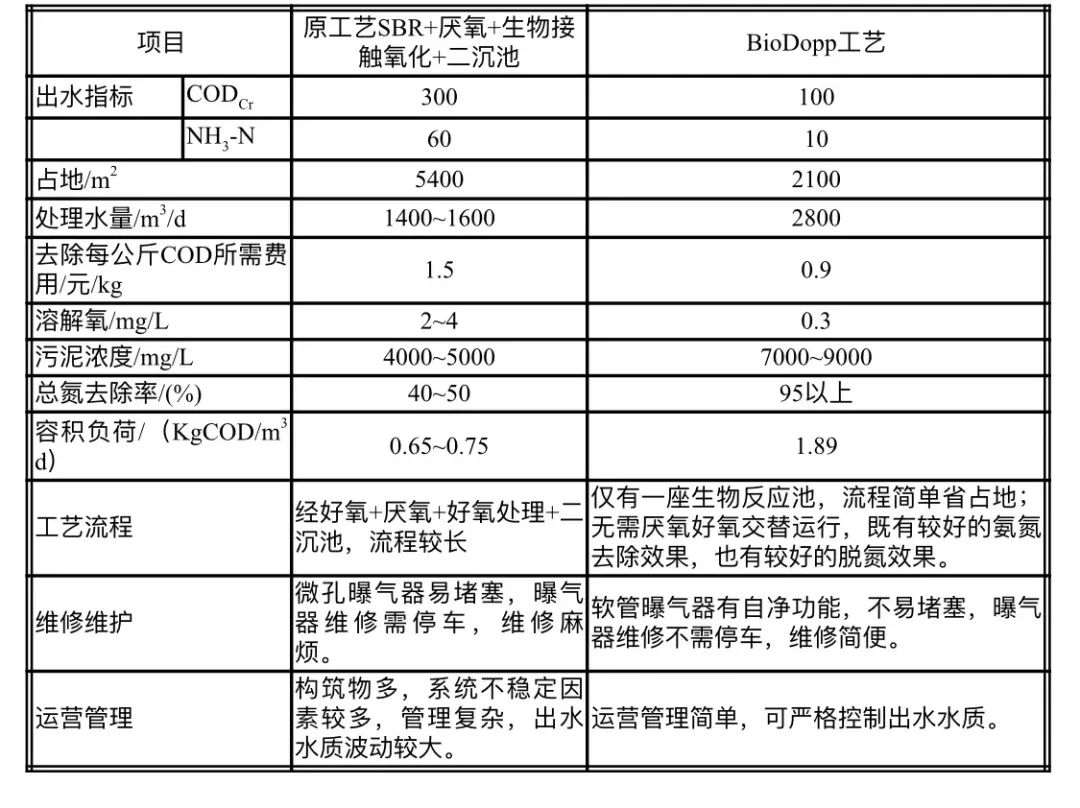 由于原SBR工艺出水难以达标加之处理规模的扩大,需对场站原工艺进行改造,改造前处理量为1600m3/d;采用BioDopp工艺对原有池体进行改造后处理量增加至2800 m3/d,为原来的1.75倍。