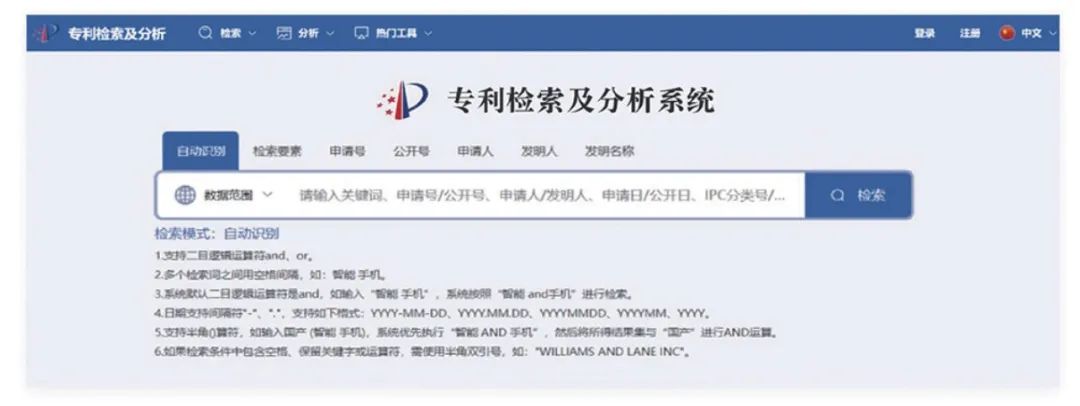 系统提供了常规检索、高级检索等6种检索方式,申请人分析、技术领域分析等6种分析方式,同族查询、引证查询等8种辅助工具,同时系统面向社会公众提供了9种语言版本的专利检索与分析功能。