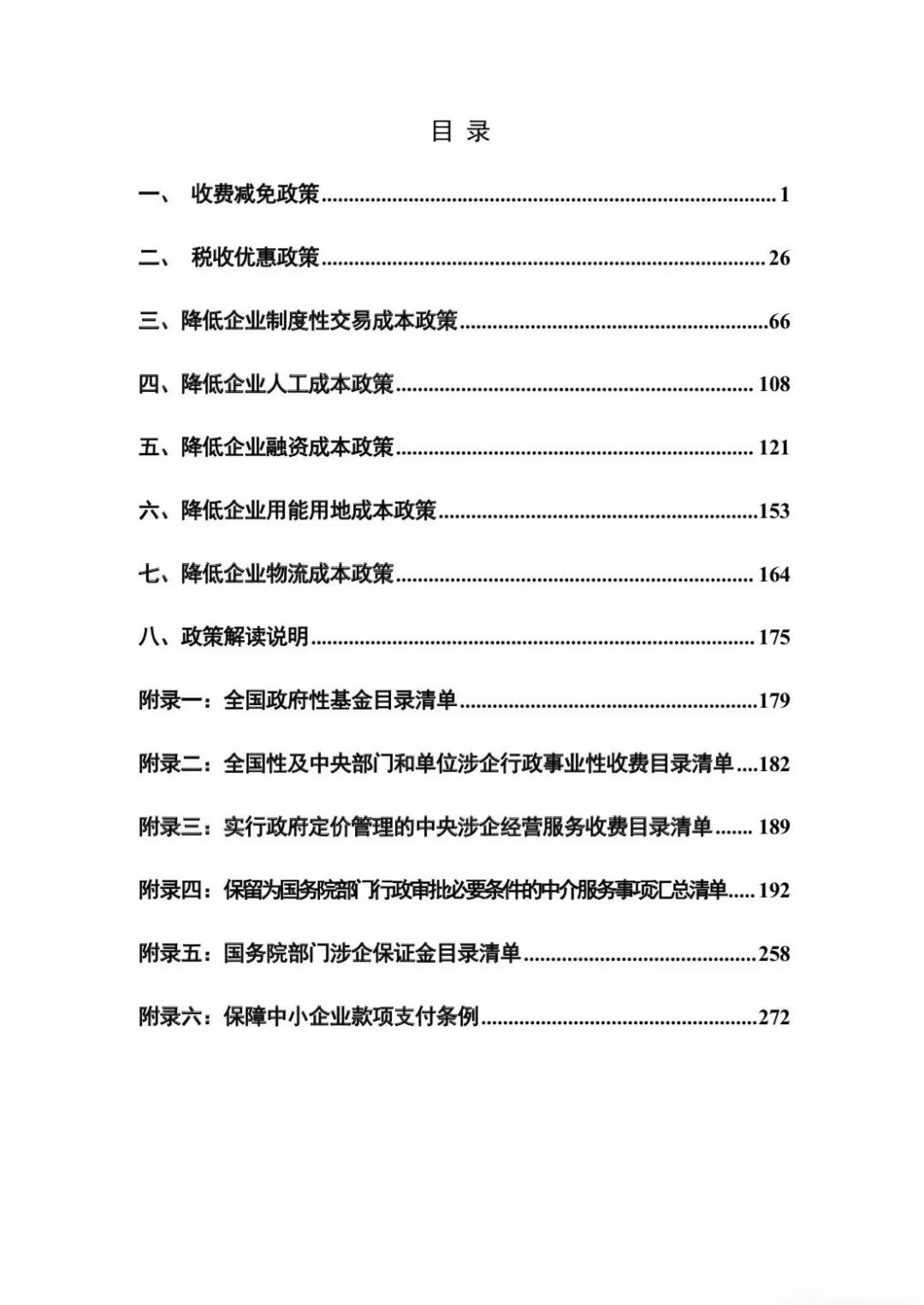 汇编采取目录清单形式,收录了收费减免税收优惠和降低企业制度性交易成本、人工成本、融资成本等方面共计 259 条正在执行的政策措施,方便企业查询。
