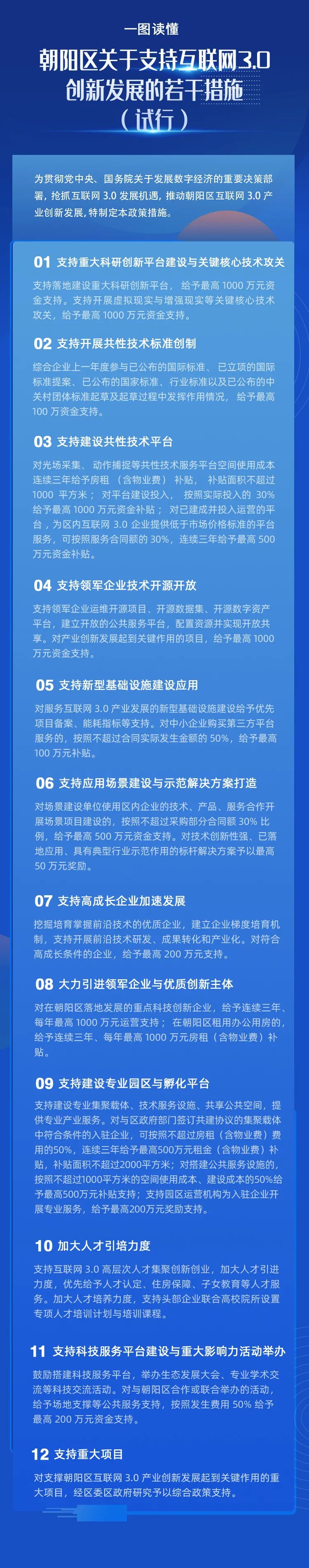 为贯彻党中央、国务院关于发展数字经济的重要决策部署,抢抓互联网3.0发展机遇,推动朝阳区互联网3.0产业创新发展,朝阳区发布《朝阳区关于支持互联网3.0创新发展的若干措施(试行)》。
