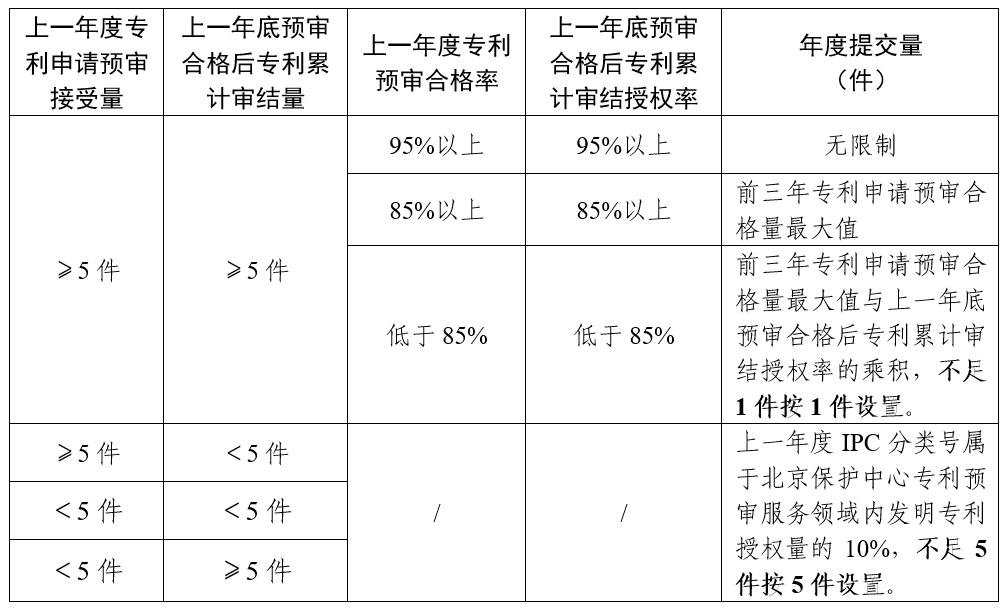 本年度提交量设置为上一年度IPC分类号属于北京市知识产权保护中心专利预审服务领域内发明专利授权量的10%,不足5件按5件设置。