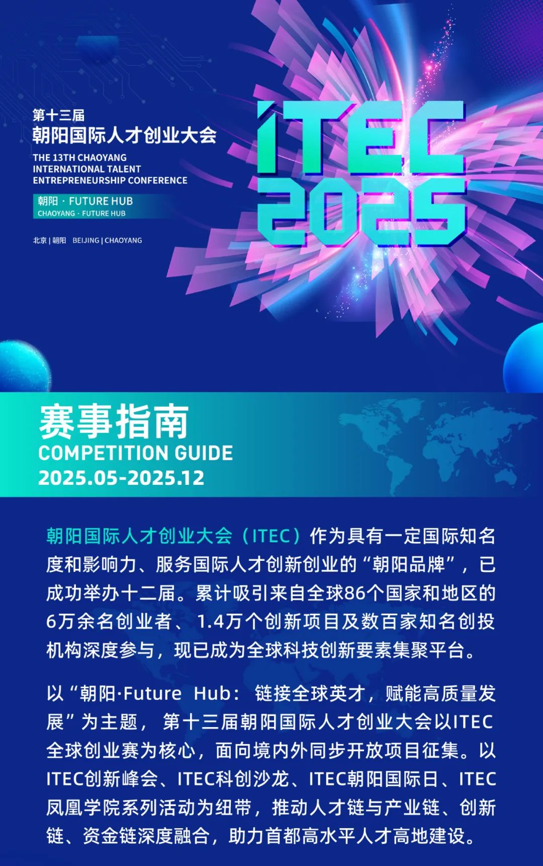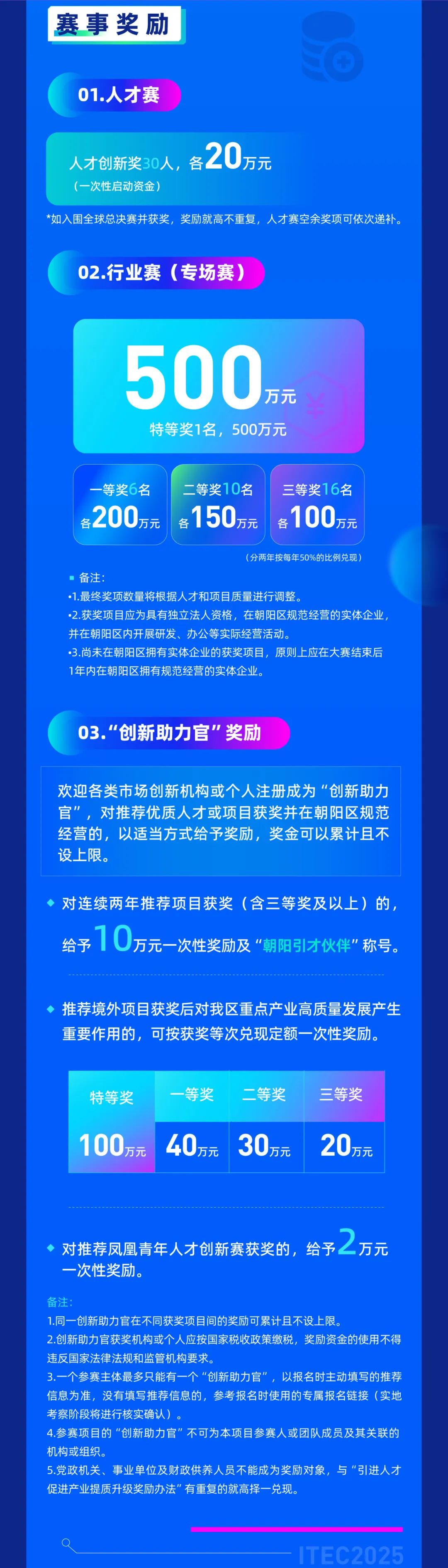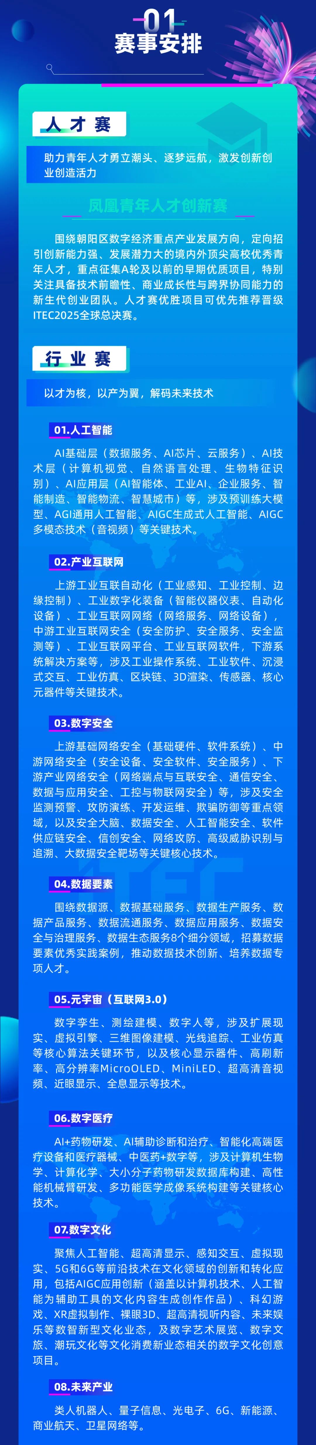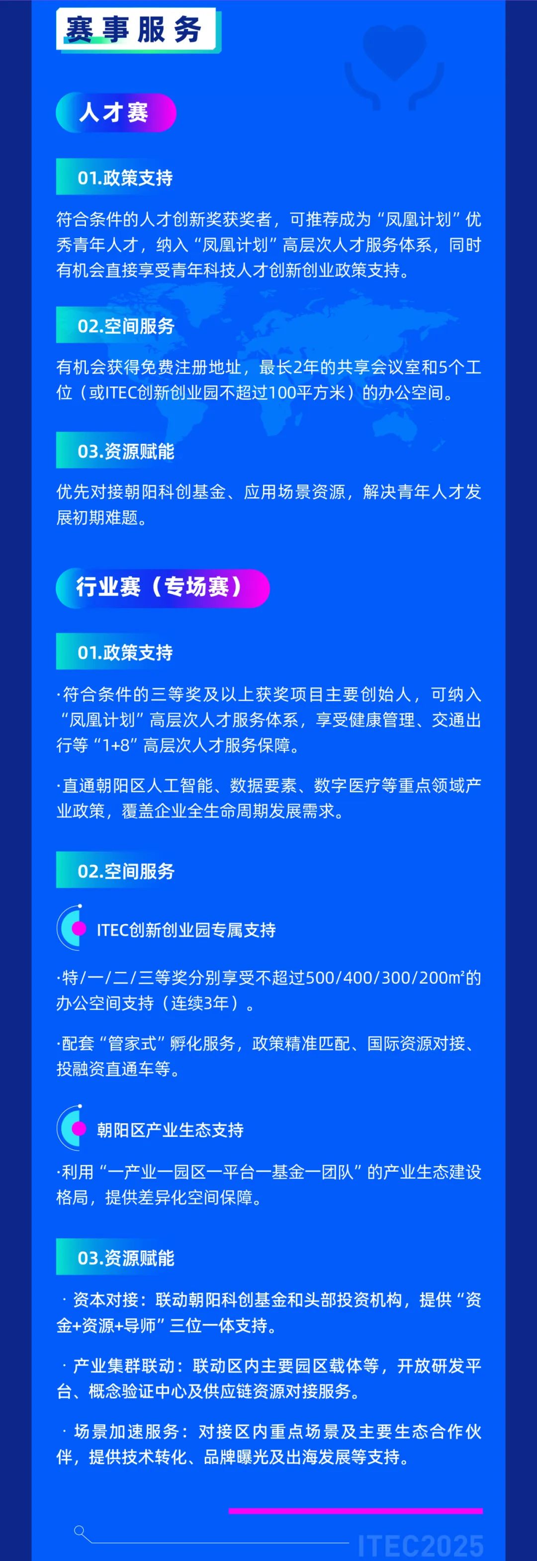 望京留创园作为ITEC创新创业园运营主体,将为获奖项目提供孵化空间、产业对接、投融资匹配、政策解读及国际化赋能等全方位支持,加速优质项目孵化落地。现报名通道已开启(即日起至2025年8月31日),诚邀全球创新创业者踊跃参与!详细赛道设置、赛程安排及报名方式如下:望京留创园专属报名二维码