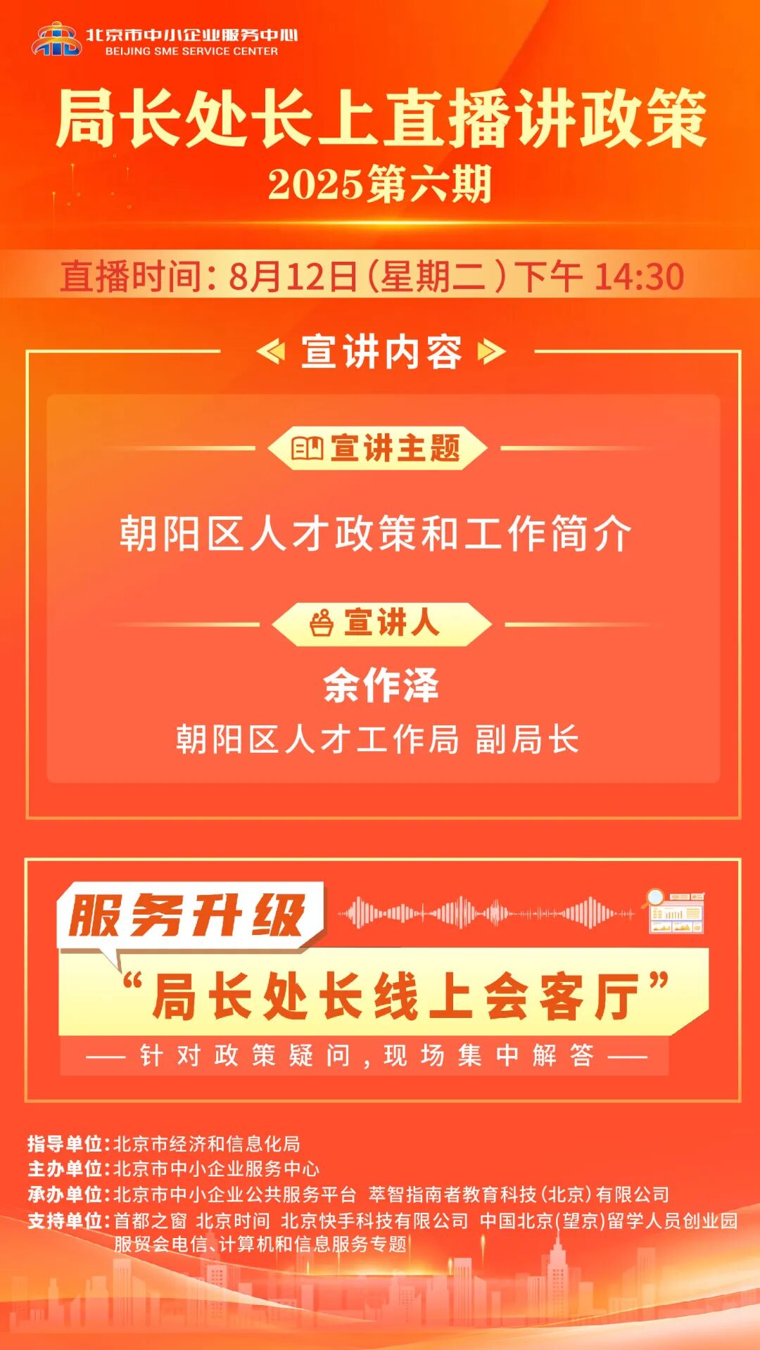 2025年第六期“局长处长上直播讲政策”于8月12日(星期二)下午14:30开讲,朝阳区人才工作局副局长余作泽将就朝阳区人才政策和工作简介进行讲解,欢迎关注