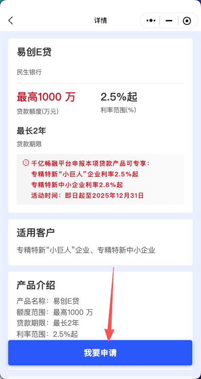 即日起至2025年12月31日,通过千亿畅融小程序申报本项贷款产品可专享专精特新“小巨人”企业利率2.5%起,专精特新中小企业利率2.8%起。
