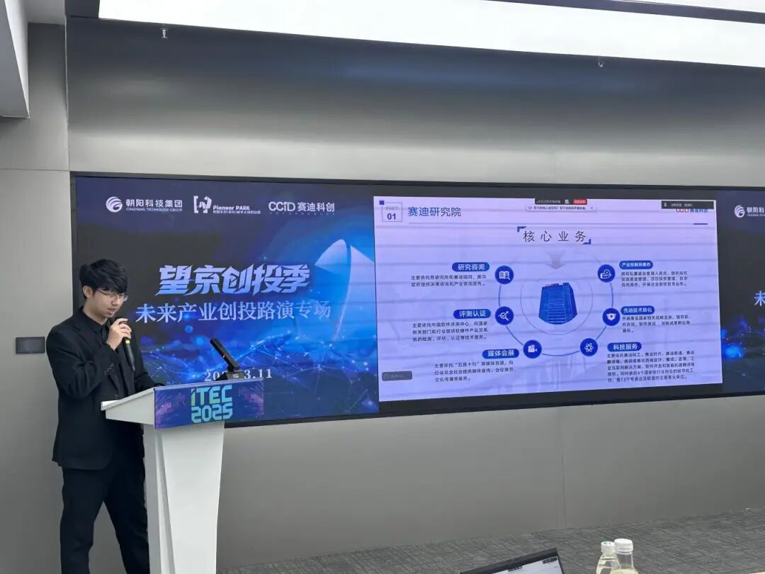 活动伊始,望京留创园相关负责人详细介绍了园区的产业生态、独创的“智链145”科创服务体系,以及朝阳区配套的特色政策支持。作为望京留创园资本加速板块的特色活动,望京创投季通过“项目路演+产业研讨+资本对接”的模式,持续搭建科创项目与资本的精准链接渠道,未来将持续助力更多科创企业高效获取资本赋能。随后,联合举办方赛迪科创相关负责人向到场的投资人、企业家表示欢迎,并重点介绍机构的科创服务能力与产业资源布局。