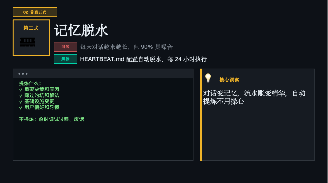 汤鹏还设计了“记忆脱水”机制,模仿人脑的记忆筛选过程:每天对对话记录进行压缩,只保留重要决策原因、踩坑记录、用户偏好等有价值信息,其余则舍弃,从而大幅降低token消耗。