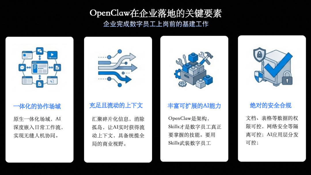 在企业落地层面,他强调数字员工必须“懂规矩”和“带工牌”。“懂规矩”是指技术和制度安全——明确AI的行为边界,防止越权操作;“带工牌”是指要核算ROI——每个数字员工都要像真人员工一样考核产出。他分享了“飞书+OpenClaw”的案例:某团队让龙虾每天自动汇总同事的OKR进展,生成周报;另一个团队让龙虾学习公司知识库,为新员工提供7×24小时答疑。更令人惊叹的是,这些龙虾能像孩子一样迭代成长——随着使用频次增加,它们会记住用户偏好,主动优化服务。