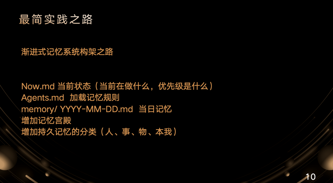 首位分享者是FizzRead创始人汤鹏。他笑称自己养了7只“龙虾”,都用猫的名字命名。春节期间,他沉迷于装虾,却接连遭遇失忆、幻觉、成本失控等问题——这些几乎是每个AI agent玩家的必经之路。他的解决方案充满巧思:为每只龙虾建立一份“灵魂Markdown文件”,文件中记录其身份设定、特长领域、与主人的关系、长期记忆要点以及每日日志。每次对话前,只要加载该文件,龙虾的“失忆症”便即刻治愈。这种方法本质上是将外部记忆以结构化文本形式存储,弥补了大模型上下文窗口的局限。