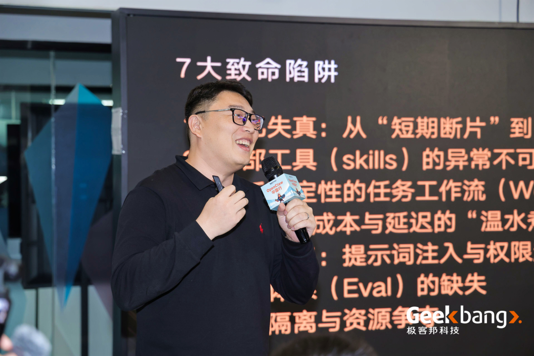 极客时间总经理尹会生紧接着带来一份务实的“避坑指南”。他从个人养虾到企业应用的经验出发,总结了必须面对的7个致命陷阱:记忆失真、技能不可控、token成本失控、安全隐患、评估体系缺失、资源争夺、幻觉误判。
