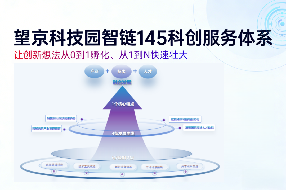 不止于产业集聚,望京科技园重磅打造智链145特色科创服务体系,以全周期服务体系+开放合作网络为核心支撑,为智能原生企业成长全程保驾护航,让创新想法从0到1孵化、从1到N快速壮大。以“产业+技术+人才”三链融合为核心锚点,紧扣智能原生产业发展需求构建全生命周期创新雨林服务网络;围绕科技成果转化、硬核项目孵化等4条发展主线,精准覆盖企业从初创到成熟的核心发展维度;通过孵化培育、技术工具、市场赋能、出海促活、资本加速五步叠加举措,提供百余项全成长周期专业服务,全方位打通技术、人才、资本、场景之间的壁垒。