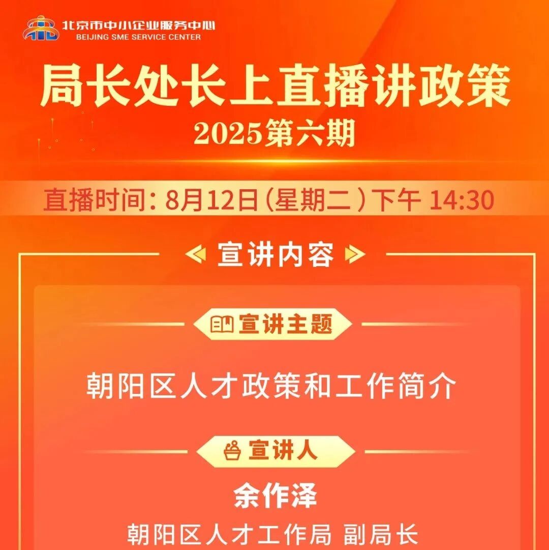 “局长处长上直播讲政策”第六期2025年第六期“局长处长上直播讲政策”于8月12日(星期二)下午14:30开讲,朝阳区人才工作局副局长余作泽将就朝阳区人才政策和工作简介进行讲解,欢迎关注点击预约,精彩直播不错过 ...
