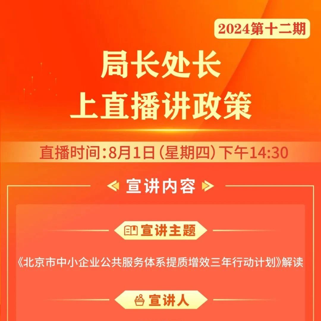 北京市经济和信息化局中小企业处处长杨靖国将于8月1日下午14:30,直播解读《北京市中小企业公共服务体系提质增效三年行动计划》,介绍三年行动的总体要求,重点任务等内容。欢迎大家踊跃关注!点击预约,精彩直播不错过 ...