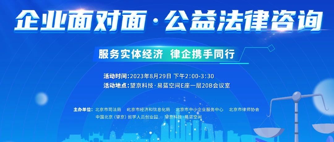 8月29日下午,由中国北京(望京)留学人员创业园、望京科技·易蓝空间携手北京市司法局、北京市经济和信息化局、北京市中小企业服务中心、北京市律师协会联合主办的“企业面对面· 公益法律咨询”活动圆满举办。此次活动以 ...